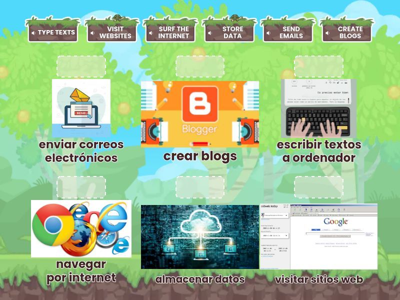 TYPE TEXTS - escribir textos a ordenador, SURF THE INTERNET - navegar por internet, STORE DATA - almacenar datos, SEND EMAILS - enviar correos electrónicos, VISIT WEBSITES - visitar sitios web, CREATE BLOGS - crear blogs,