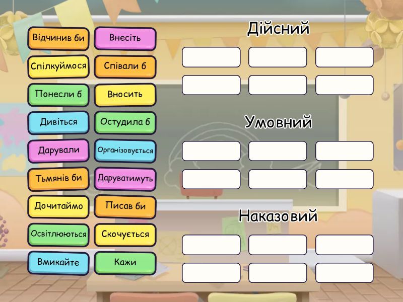 Дійсний: Скочується, Організовується, Даруватимуть, Освітлюються, Вносить, Дарували, Умовний: Понесли б, Остудила б, Відчинив би, Співали б, Тьмянів би, Писав би, Наказовий: Внесіть, Дочитаймо, Спілкуймося, Кажи, Вмикайте, Дивіться,