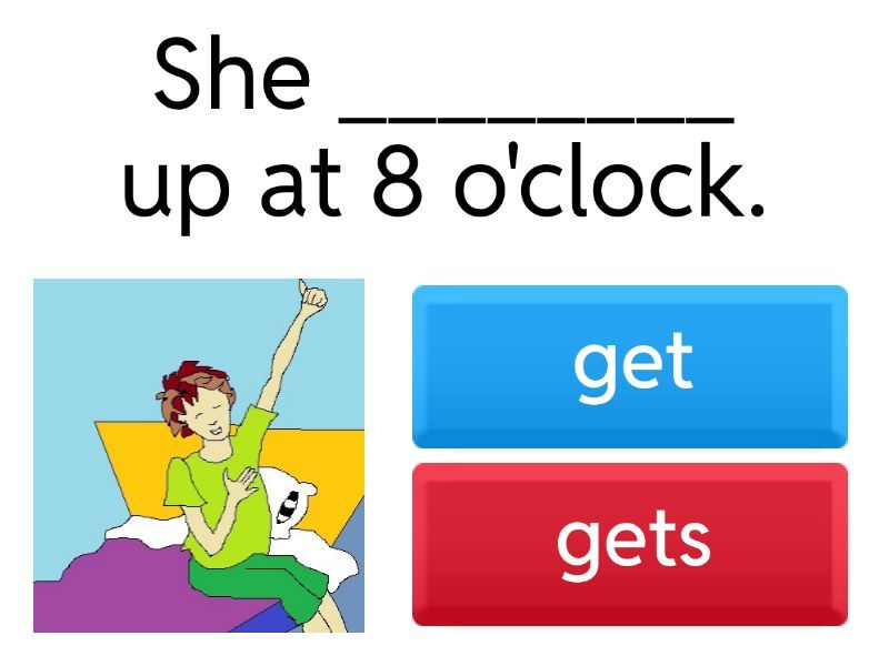1) She ________ up at 8 o'clock. a) get b) gets 2) I ______ my teeth. a) brush b) brushes 3) My friends _______ to school. a) go b) goes 4) He _______ breakfast at 9 o'clock. a) have b) has 5) We _______ our beds in the morning. a) make b) makes 6) My cousins ______ home in the afternoon. a) go b) goes 7) My aunt _______ dinner in the evening. a) have b) has 8) The dog ______ for a walk every day. a) go b) goes 9) He _____ to bed at 10 o'clock. a) go b) goes 10) I _____ to bed at 11 o'clock. a) go b) goes