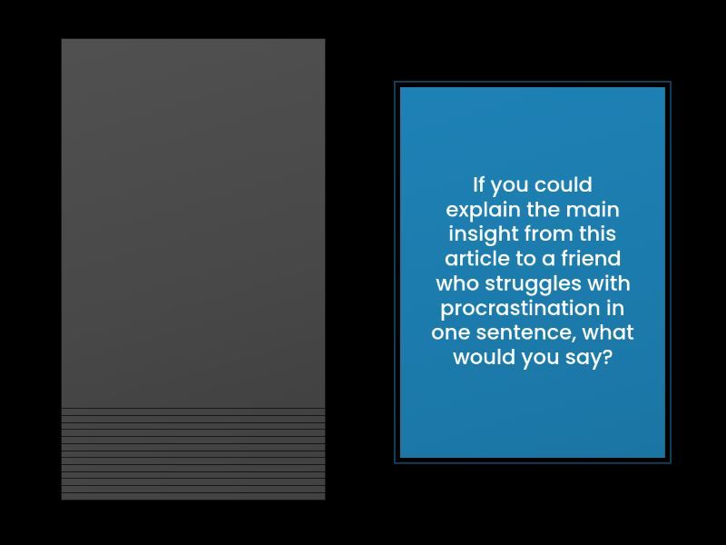 What are people who chronically procrastinate prone to?, What is procrastination linked to on the mental health front?, How does procrastination influence relationships?, According to the article, why do we procrastinate on big tasks?, What form of procrastination might little tasks lead to? Why do we procrastinate on them?, Sirois states procrastination actually has to do with mood management. What does she mean by that?, What is the "cognitive cost" mentioned in the article, and how does it relate to small tasks?, What is the "two-minute rule" and what is its psychological purpose?, How can perfectionism contribute to procrastinating on tiny tasks?, What positive effect can completing a dreaded small task have?, The article frames procrastination as an emotional regulation issue, not a time-management one. Does this change how you view your own procrastination habits? How?, Which reason for micro-procrastination resonates with you the most: the "activation energy," fear of the outcome, or something else? Why?, Do you think strategies like the "Two-Minute Rule" are genuinely effective, or do they oversimplify a complex psychological problem?, The article suggests we should be more self-compassionate when we procrastinate. Do you agree, or do you think a bit of self-criticism is necessary to motivate action?, If you could explain the main insight from this article to a friend who struggles with procrastination in one sentence, what would you say?.