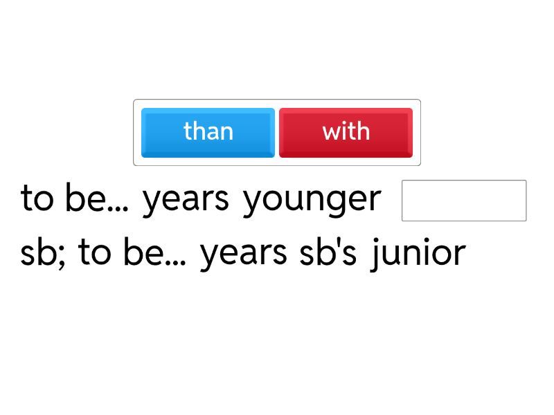 to be... years younger ____ sb; to be... years sb's junior to look young ____ one's age to outlive sb ____ ... years to be of the same age; to be the same ____ as so ____ be born
