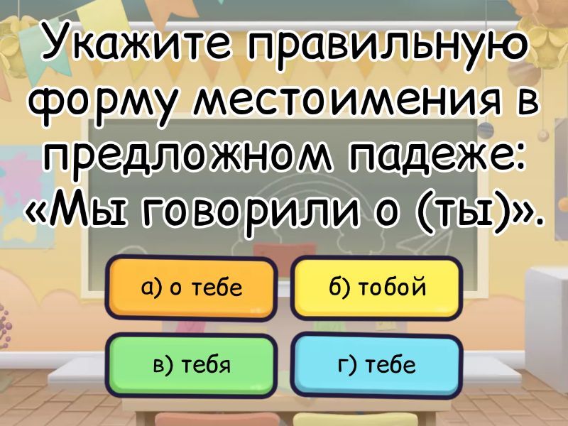 1) Укажите правильную форму местоимения в предложном падеже: «Мы говорили о (ты)». a) а) о тебе b) б) тобой c) в) тебя d) г) тебе 2) Как правильно написать: «Подарок был приготовлен для (они)»? a) а) их b) б) них c) в) ими d) г) им 3) В каком предложении нарушено правописание местоимения? a) а) Я скучаю по вам. b) б) Расскажи мне от её успехах. c) в) Он подошёл ко мне. d) г) Мы гордимся тобой. 4) Выберите верный вариант: «Это письмо адресовано (вы)». a) а) вам b) б) вами c) в) вас d) г) вы 5) Как правильно написать: «У (я) нет сомнений»? a) а) у меня b) б) у мене c) в) у мня d) г) у мне