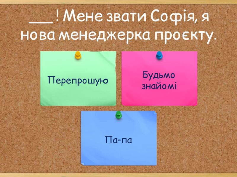 1) ___ ! Мене звати Софія, я нова менеджерка проєкту. a) Будьмо знайомі b) Па-па c) Перепрошую 2) ___ , будь ласка! Це мій колега Петро. Ми працюємо разом. a) Познайомтесь b) Бувайте c) Скажіть 3) Я хочу ___ вас із нашою директоркою. Вона зараз підійде. a) представити b) познайомити c) попросити 4) – Мене звати Тім. Я з Німеччини. – ___ ! Мене звати Галина. a) Бувайте b) На все добре c) Дуже приємно 5) – Ви давно ___ один одного? – Так, ще зі школи! a) знаєте b) називаєте c) звете 6) – Можемо обмінятися телефонами? – ___ a) Добраніч! b) Навзаєм. c) Звісно! 7) ___ , дорога бабусю! Як ти? Як твої справи? a) Доброго здоров'я b) Бувай здорова c) Бувай