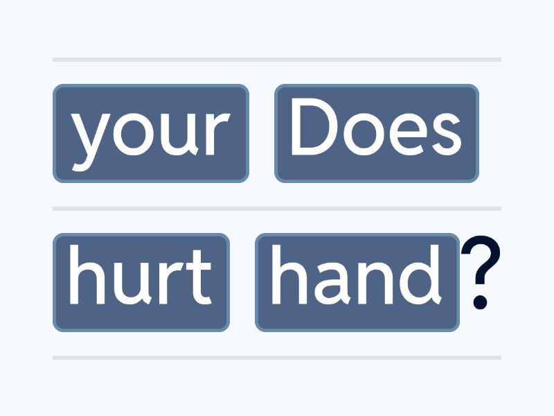 Does your hand hurt?, Yes, my hand hurts., Does your neck hurt?, No, my neck doesn't hurt., Does her throat hurt?, Yes, her throat hurts., Does her knee hurt?, No, her knee doesn't hurt., Does his elbow hurt?, Yes, his elbow hurts., Does his ear hurt?, No, his ear doesn't hurt.,