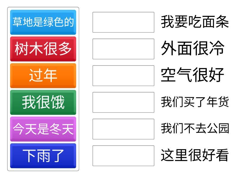 下雨了 - 我们不去公园, 草地是绿色的 - 这里很好看, 夜里是黑色的 - 我们要开灯, 为西瓜很大 - 我们一起吃, 树木很多 - 空气很好, 他生病了 - 没去上学, 我很饿 - 我要吃面条, 天气很热 - 我喝了很多水, 今天是冬天 - 外面很冷, 下雨 - 我带雨伞, 过年 - 我们买了年货,