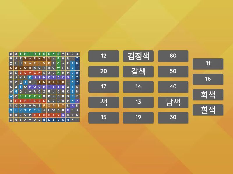 brown - 갈색, gray - 회색, black - 검정색, white - 흰색, indigo - 남색, eleven - 11, twelve - 12, thirteen - 13, fourteen - 14, fifteen - 15, sixteen - 16, twenty - 20, thirty - 30, forty - 40, fifty - 50, nineteen - 19, eighty - 80, seventeen - 17, color - 색,