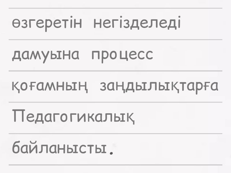 Педагогикалық процесс қоғамның дамуына байланысты өзгеретін заңдылықтарға негізделеді., Оқыту мен тәрбиелеудің тиімділігі оқушының жас ерекшелігі мен мүмкіндіктерін ескерумен анықталады., Мұғалім оқу материалын жүйелі, бірізді және ғылыми негізде ұйымдастыруы қажет., Көрнекілік, қолжетімділік және теорияны практикамен байланыстыру принциптері оқу сапасын арттырады., Педагогикалық процестің барлық элементтері тәрбиелік мақсатпен ұштасып, тұлғаның жан-жақты дамуына бағытталады.,