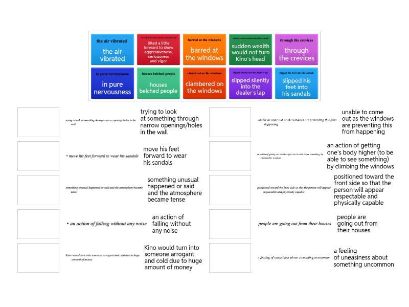 step out of regular thought and the known and trusted pattern - to do something that is not common or accepted, to tithe first fruits of the luck - to ask for one’s share from someone’s sudden good fortune , excitement in the hunt - - a great feeling of eagerness especially about a search on something, the air vibrated - something unusual happened or said and the atmosphere became tense , air is insubstantial - a situation where attention is focused on something that the environment doesn't matter that much, sudden wealth would not turn Kino’s head - Kino would turn into someone arrogant and cold due to huge amount of money , would not graft onto him limbs of greed, hatred and coldness - he would not develop an evil character (a personification of human characteristics) , through the crevices - trying to look at something through narrow openings/holes in the wall , tilted a little forward to show aggressiveness, seriousness and vigor - positioned toward the front side so that the person will appear respectable and physically capable, slipped his feet into his sandals - move his feet forward to wear his sandals, draped it in a narrow strip over his shoulder - wrapped his shoulder with a piece of clothing (a narrow strip - size) , houses belched people - people are going out from their houses, doorways spewed out children - children are seen passing through the doorways, cautioned his brother - a warning about something received from his brother, in pure nervousness - a feeling of uneasiness about something uncommon, far deep in the darkness of the walls - someone or something is hiding and cannot be easily seen on the walls , were hissed to silence by their elders - use of the “sh” sound to stop the noise (usually in an angry manner) , sun beat down on the streets of the city - it’s a sunny day (sun’s heat is felt) and it is everywhere especially on the streets , pearl buyers stiffened and grew alert - they are unable to do the normal bodily movements and are quick to notice something as a result of sudden their surprise or due to an unexpected happening, barred at the windows - unable to come out as the windows are preventing this from happening , face that is fatherly and benign - face that is protective, caring and harmless (as a father), eyes twinkled with friendship - friendly eyes (as in inviting someone to engage in friendship), hovered close to sadness - an attitude lacking energy and optimism, hummed under his breath - carrying a tune under closed lips (so not to be heard), peered out the door - taking one’s gaze towards the door area/looking outside, as steady and cruel as a hawk’s eyes - eyes that show no sympathy or affection, clambered on the windows - an action of getting one’s body higher (to be able to see something) by climbing the windows , fingers worked furiously with the coin - an action of the fingers in which they are moving energetically and hurriedly, coin stumbled over a knuckle - the coin has missed on it’s supposed path or destination, slipped silently into the dealer’s lap - an action of falling without any noise,