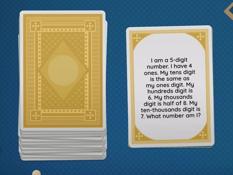 I have 4 thousands. My hundreds digit is 2 more than my tens digit. My ones digit is 1. My tens digit is 3. What number am I?, I am a 5-digit number. I have 7 tens. I have 4 hundreds. I have 3 ones. My thousands digit is double my hundreds digit. My ten-thousands digit is 9. What number am I?, I have 6 thousands. My hundreds digit is 5 more than my ones digit. My tens digit is 2. My ones digit is 3. What number am I?, I am a 4-digit number. My thousands digit is 9. My tens digit is 4 more than my ones digit. My hundreds digit is 0. My ones digit is 3. What number am I?, I have 3 thousands. My hundreds digit is double my ones digit. My tens digit is 7. My ones digit is 4 What number am I?, I am a 5-digit number. I have 4 ones. My tens digit is the same as my ones digit. My hundreds digit is 6. My thousands digit is half of 8. My ten-thousands digit is 7. What number am I?, I have 5 digits. My ones digit is 9. My tens digit is 1 less than my ones digit. My hundreds digit is 3. My thousands digit is 8. My ten-thousands digit is 6. What number am I?, I have 2 thousands. My hundreds digit is 9. My ones digit is 2 less than my tens digit. My tens digit is 5. What number am I?, I am a 4-digit number. My thousands digit is 5. My tens digit is double my ones digit. My hundreds digit is 7. My ones digit is 4. What number am I?, I am a 5-digit number. My ones digit is 6. My tens digit is 0. My hundreds digit is 2 more than my ones digit. My thousands digit is 5. My ten-thousands digit is 3. What number am I?, I have 8 thousands. My hundreds digit is 1. My tens digit is 3 more than my hundreds digit. My ones digit is 7. What number am I?, I am a 4-digit number. My ones digit is 5. My tens digit is 1 more than my ones digit. My hundreds digit is 6. My thousands digit is 2 What number am I?, I am a 5-digit number. My ten-thousands digit is 8. My ones digit is 1. My hundreds digit is 5 more than my ones digit. My tens digit is 2. My thousands digit is 3. What number am I?.