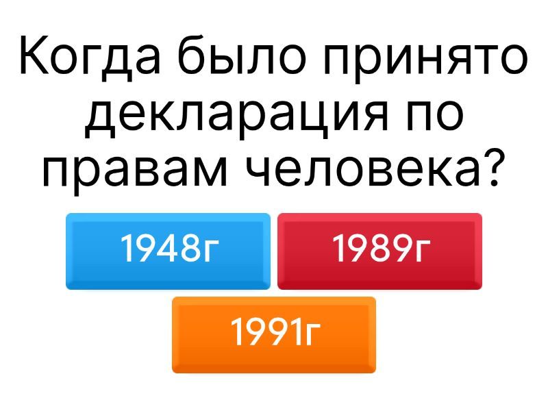 1) Когда было принято декларация по правам человека? a) 1948г b) 1989г c) 1991г 2) Когда было принято Конвенция по правом ребёнка? a) 1954г b) 1989г c) 1948г 3) Какая из указанных является правом ребёнка? a) Получать образование b) Убирать свою комнату c) заниматься домашними делами. 4) Какая из указанных является обязанностью ребёнка?  a) Право на отдых b) право на учёбу c) соблюдать правила школу 5) Документ, в котором закреплены права ребёнка:   a) трудовой кодекс b) устав класса c) Конвенция о правах ребёнка