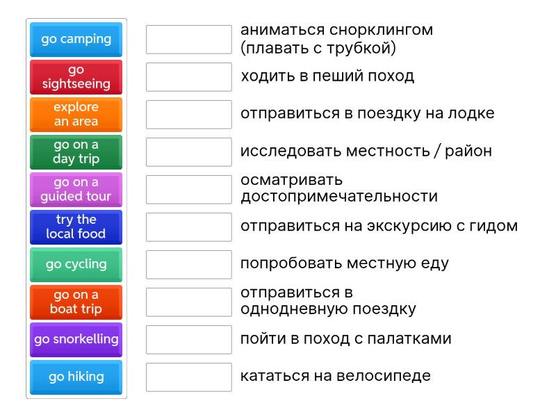 go sightseeing - осматривать достопримечательности, explore an area - исследовать местность / район, go camping - пойти в поход с палатками, go cycling - кататься на велосипеде, go hiking - ходить в пеший поход, go on a boat trip - отправиться в поездку на лодке, go on a day trip - отправиться в однодневную поездку, go on a guided tour - отправиться на экскурсию с гидом, go snorkelling - аниматься снорклингом (плавать с трубкой), try the local food - попробовать местную еду,