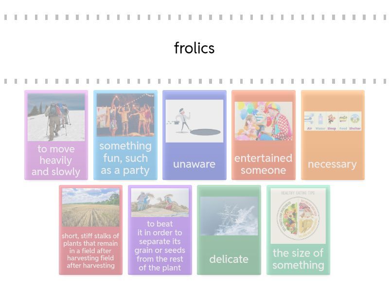 something fun, such as a party - frolics, short, stiff stalks of plants that remain in a field after harvesting field after harvesting - stubble, necessary - indispensable, delicate - dainty, to move heavily and slowly - plod, unaware - oblivious, the size of something - proportions, entertained someone - regaled, to beat it in order to separate its grain or seeds from the rest of the plant - thresh,