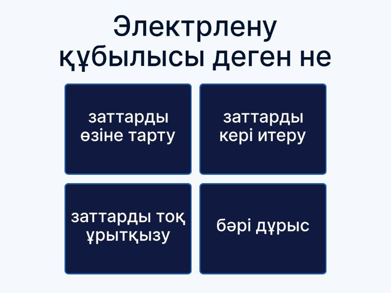 1) Электрлену құбылысы деген не a) заттарды өзіне тарту b) заттарды кері итеру c) заттарды тоқ ұрытқызу d) бәрі дұрыс 2) заттар қай кезде бірбіріне тартылады a) 2 затта электрленгенде b) 2 затта электрмегенде c) 1 зат электрленіп 1 зат электрмегенде d) бәрі қате 3) e=1.6•10(??Кл) a) -9 b) -19 c) 9 d) 19 4) электр заряды деген не a) электрлік механика b) электрлік тоқ c) ват d) электрлік әсердің физикалық күші 5) электр зарядның екі тегі олар... a) оң және сол b) оң және теріс c) көп және аз d) үлкен және кішкентай 6) егер зарядтар жақындаса a) күш артады b) күш азаяды c) күш өзгермейді d) бәрі қате 7) оң элементің бөлшегі a) нейтрон b) электрон c) протон d) заряд 8) Қай материал тоқты жақсы өткізеді? a) ағаш b) қағаз c) мақта d) темір 9) Нейтрон қандай бөлшек a) теріс зарядталған бөлшек b) заряды жоқ бейтарап c) тек сыртқа орбитада жүретін бөлшек d) Оң зарядталған бөлшек 10) егер заряд алыстаса... a) күш артады b) күш өзгермейді c) күш азаяды d) бірі қате