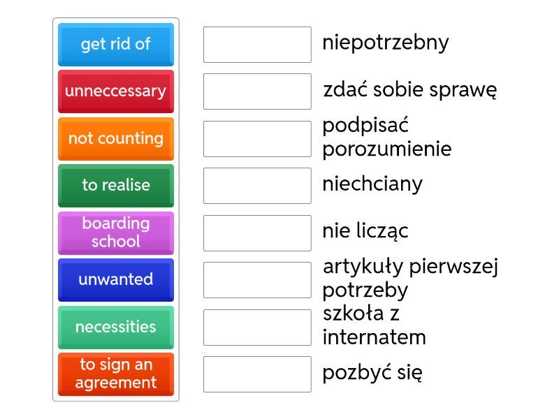 get rid of - pozbyć się, not counting - nie licząc, unneccessary - niepotrzebny, to sign an agreement - podpisać porozumienie, boarding school - szkoła z internatem, unwanted - niechciany, to realise - zdać sobie sprawę, necessities - artykuły pierwszej potrzeby,
