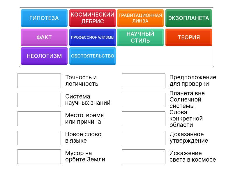 НЕОЛОГИЗМ - Новое слово в языке, ЭКЗОПЛАНЕТА - Планета вне Солнечной системы, ГРАВИТАЦИОННАЯ ЛИНЗА - Искажение света в космосе, КОСМИЧЕСКИЙ ДЕБРИС - Мусор на орбите Земли, НАУЧНЫЙ СТИЛЬ - Точность и логичность, ПРОФЕССИОНАЛИЗМЫ - Слова конкретной области, ОБСТОЯТЕЛЬСТВО - Место, время или причина, ГИПОТЕЗА - Предположение для проверки, ТЕОРИЯ - Система научных знаний, ФАКТ - Доказанное утверждение,