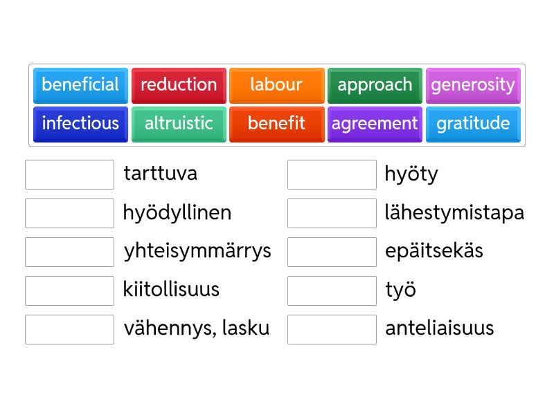 pursuit - tavoittelu, conventional - tavanomainen, approach - lähestymistapa, labour - työ, promotion - ylennys, target - tavoite, productive - tuottoisa, beneficial - hyödyllinen, appealing - houkutteleva, content - tyytyväinen, agreement - yhteisymmärrys, tension - jännitys, benefit - hyöty, reduction - vähennys, lasku, generosity - anteliaisuus, altruistic - epäitsekäs, gratitude - kiitollisuus, contentment - tyytyväisyys, infectious - tarttuva,