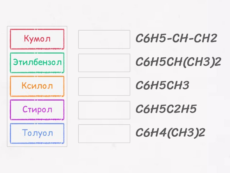 Толуол - C6H5CH3, Этилбензол - C6H5C2H5, Ксилол - C6H4(CH3)2, Кумол - C6H5CH(CH3)2, Стирол - C6H5-CH-CH2,