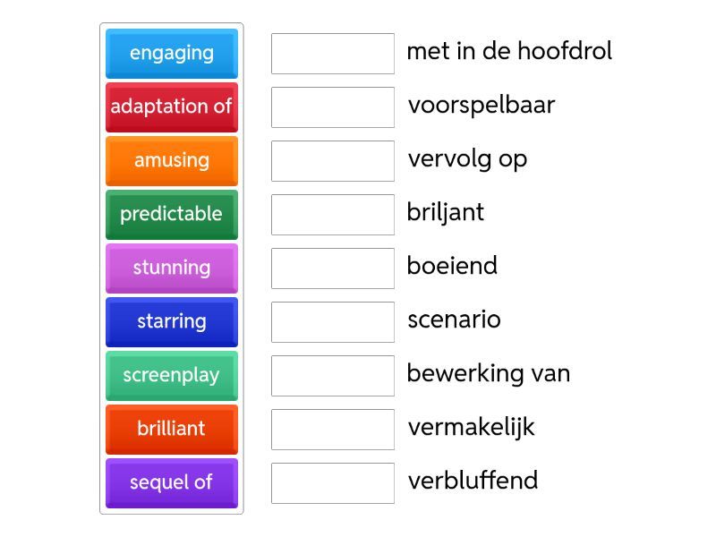 adaptation of - bewerking van, amusing - vermakelijk, brilliant - briljant, convincing - overtuigend, directed by - geregisseerd door, engaging - boeiend, holds your attention - houdt je aandacht, inspiring - inspirerend, masterpiece - meesterwerk, performance - optreden / prestatie, predictable - voorspelbaar, remake of - remake van, screenplay - scenario, sequel of - vervolg op, starring - met in de hoofdrol, stunning - verbluffend, suitable for - geschikt voor, superb - voortreffelijk,