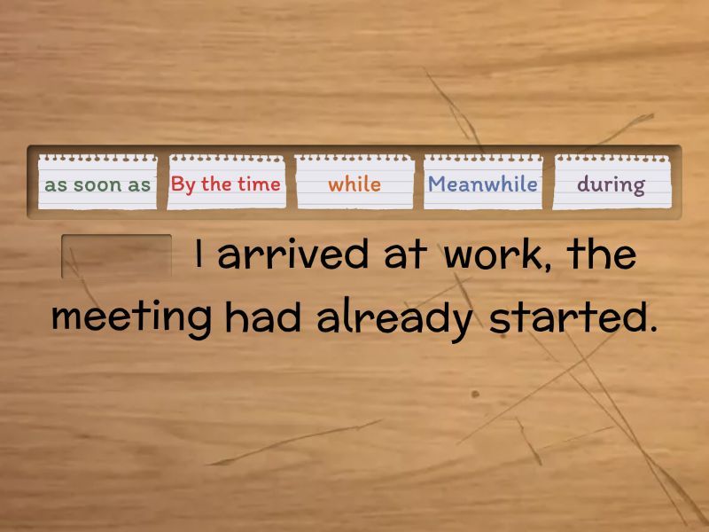 ____ I arrived at work, the meeting had already started. He burned his hand ____ he was taking the tray out of the oven. I’ll finish prepping the vegetables ____ you clean the chopping boards. The chefs were busy preparing desserts ____ the guests were being seated. We can’t serve the soup ____ it reaches the right temperature. The fire alarm went off ____ the conference was in progress. The laundry will be ready ____ the end of the afternoon shift. The dishwasher had broken down. ____, the staff washed the plates by hand. ____ the housekeeping team cleaned the rooms, the maintenance team fixed the shower. We need to leave for the delivery ____ the van arrives. ____ the chef finished preparing the main course, the guests were already waiting. Please stay in the staff room ____ your supervisor calls you. There was a power cut ____ the breakfast service. I started cleaning the kitchen ____ the manager arrived.