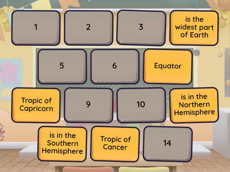 Equator - is the widest part of Earth, Tropic of Cancer - is in the Northern Hemisphere, Tropic of Capricorn - is in the Southern Hemisphere, Arctic Circle - surrounds the North Pole, Antarctic Circle - surrounds the South Pole, The tropics are usually - the hottest areas on Earth, The circles are usually - the coldest areas on Earth,