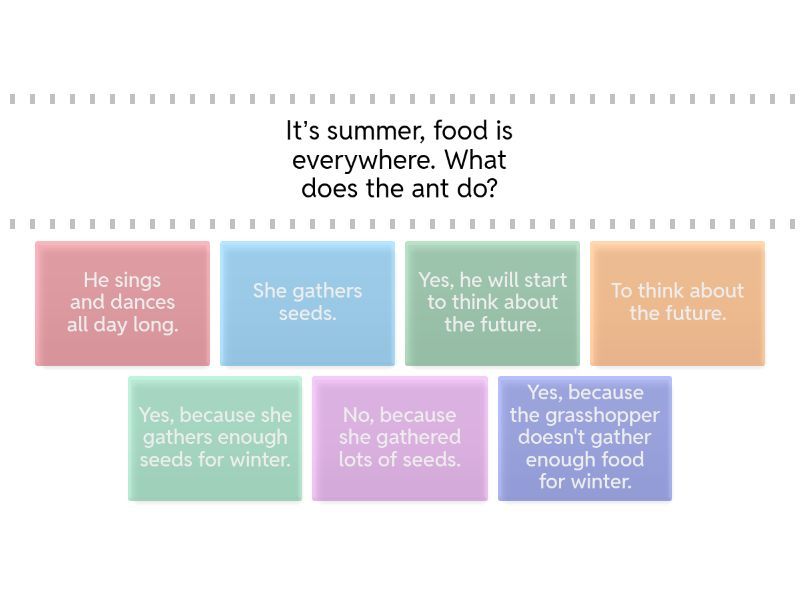 She gathers seeds. - It’s summer, food is everywhere. What does the ant do?, He sings and dances all day long. - It’s summer, food is everywhere. What does the grasshopper do?, To think about the future. - What lesson do we learn from the ant?, Yes, he will start to think about the future. - Do you think grasshopper survives?, No, because she gathered lots of seeds. - Is ant going to be hungry in winter time?, Yes, because the grasshopper doesn't gather enough food for winter. - Is grasshopper a lazy and foolish creature?, Yes, because she gathers enough seeds for winter. - Is ant a hard-working creature?,