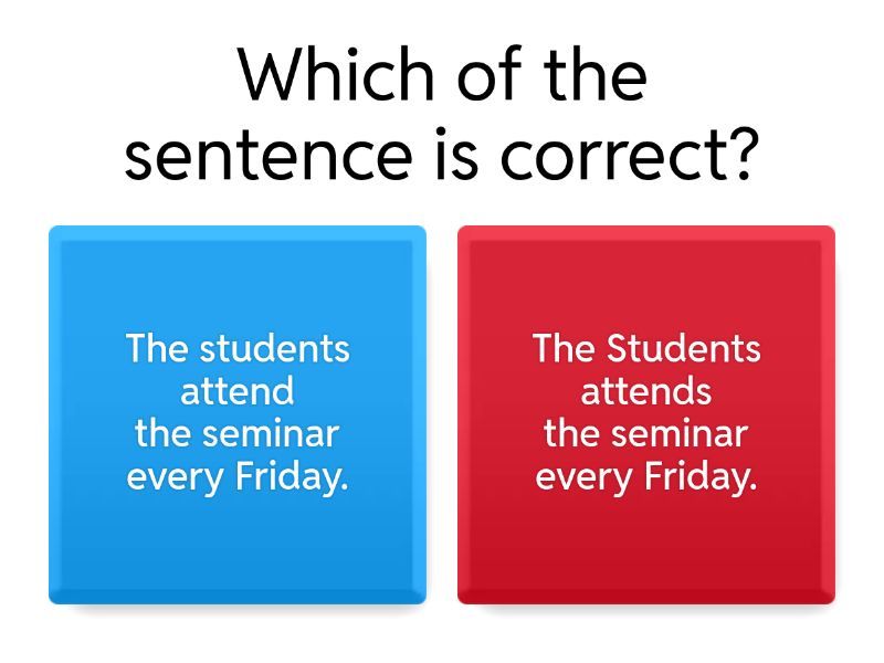 1) Which of the sentence is correct? a) The students attend the seminar every Friday. b) The Students attends the seminar every Friday. 2) Which of the sentence is correct? a) My sister likes to read novels. b) My sister like to read novels. 3) Which of the sentence is correct? a) The bouquet of flowers is on the table. b) The bouquet of flowers are on the table. 4) Which of the sentence is correct? a) Each participant receives a certificate.  b) Each participant receive a certificate. 5) Which of the sentence is correct? a) The dogs barks loudly at night. b) The dog bark loudly at night.