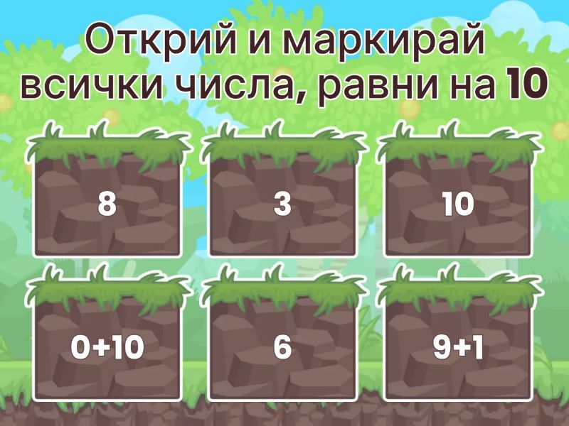 1) Открий и маркирай всички числа, равни на 10 a) 8 b) 3 c) 10 d) 0+10 e) 6 f) 9+1 2) Открий и маркирай всички числа, равни на 1 a) 11 b) 10 c) 1 d) 1+0 e) 5 f) 1+1 3) Открий и маркирай всички числа, равни на 5 a) 5 b) 5+0 c) 2+3 d) 1+2 e) 2+2 f) 15 4) Открий и маркирай всички числа, равни на 0 a) 1–1 b) 0 c) 10 d) 0+2 e) 1+0 f) 0+0 5) Открий и маркирай всички числа, равни на 7. a) 1+7 b) 7–0 c) 7 d) 5+2 e) 7+0 f) 7–1 6) Открий и маркирай всички числа, равни на 11 a) 1 b) 0+11 c) 10+1 d) 11–0 e) 10 f) 11