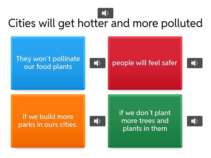 1) Cities will get hotter and more polluted a) They won´t pollinate our food plants b) people will feel safer c) if we build more parks in ours cities. d) if we don´t plant more trees and plants in them 2) If we don´t help bees and others insects, a) They won´t pollinate our food plants b) people will feel safer c) if we build more parks in ours cities. d) if we don´t plant more trees and plants in them 3) If unused land is turned into pocket parks, a) They won´t pollinate our food plants b) people will feel safer c) if we build more parks in ours cities. d) if we don´t plant more trees and plants in them 4) It will be easier for people to exercise a) They won´t pollinate our food plants b) people will feel safer c) if we build more parks in ours cities. d) if we don´t plant more trees and plants in them