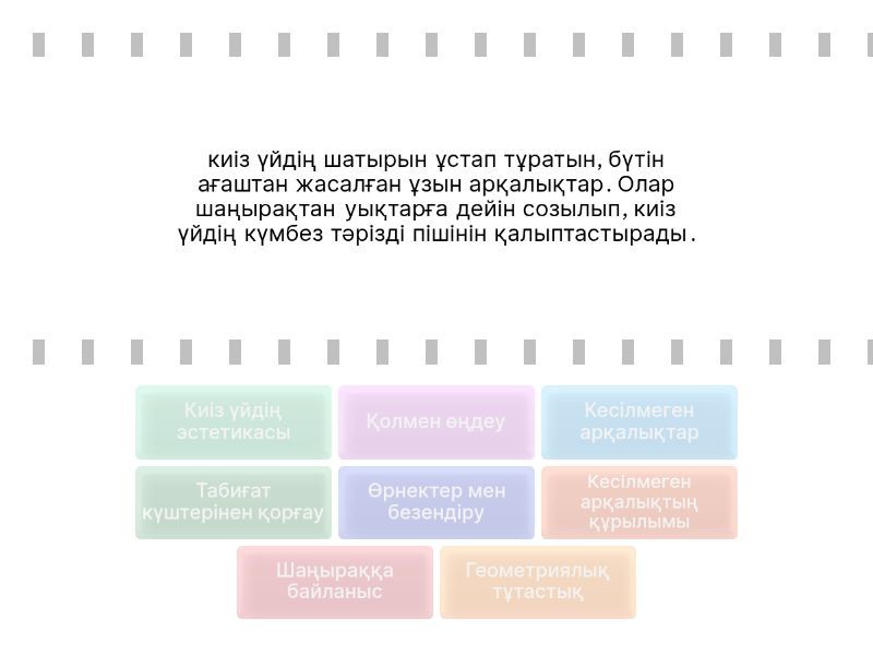 Кесілмеген арқалықтар - киіз үйдің шатырын ұстап тұратын, бүтін ағаштан жасалған ұзын арқалықтар. Олар шаңырақтан уықтарға дейін созылып, киіз үйдің күмбез тәрізді пішінін қалыптастырады., Шаңыраққа байланыс - Арқалықтар жоғарғы ұшымен шаңыраққа тіреледі және оның айналасында симметриялы түрде орналасады. Шаңырақ — киіз үйдің "көзі" болып табылса, арқалықтар оның "жапырақтары" сияқты әсер береді, табиғи үйлесімділік қалыптастырады., Геометриялық тұтастық - Арқалықтардың ұзындығы мен бүтіндігі киіз үйдің дұрыс геометриялық пішінін қамтамасыз етеді. Ағаштың табиғи иілуі мен мықтылығы арқалықтың жүктемеге төзімділігін арттырады, ұзақ мерзімді қызмет етуіне мүмкіндік береді., Табиғат күштерінен қорғау - Арқалықтардың берік құрылымы киіз үйді қысқы суық пен жазғы ыстықтан сенімді қорғайды. Олардың кесілмеген болуы бүкіл құрылымның беріктігін арттырып, қатты дауыл мен қарға төтеп беруге мүмкіндік береді. Табиғи ағаш материалы климаттық жағдайларға бейімделуге көмектеседі., Қолмен өңдеу - Дәстүрлі қазақ шеберлері арқалықтарды қолмен өңдейді, әрбір детальды мұқият пішіндейді. Арнайы сатылар мен қашулармен ағашты жылтыратып, оған керемет түр беріп, ұзақ мерзімге сақталуын қамтамасыз етеді. Бұл процесс айлардай уақыт алуы мүмкін., Өрнектер мен безендіру - Әрбір арқалықтың өзіндік ерекшелігі мен сипаты бар. Шеберлер арқалықтарға дәстүрлі қазақ өрнектерін салып, оларды киіз үйдің көркемдік элементіне айналдырады. Мұндай өрнектер тек сәндік мәнге ие емес, рухани мағынасы да бар., Киіз үйдің эстетикасы - Кесілмеген арқалықтар киіз үйдің жалпы көркемдік мәнін арттырады. Олардың табиғи сұлулығы, дұрыс пропорциялары және өрнектермен безендірілуі киіз үйді тек тұрғын үй емес, нағыз өнер туындысына айналдырады. Бұл — қазақ халқының эстетикалық дәрежесінің дәлелі., Кесілмеген арқалықтың құрылымы - бұл ғасырлар бойы жетілдірілген инженерлік шешім. Әрбір бөлшегінің өз атауы мен функциясы бар: жоғарғы ұшы шаңыраққа бекітілетін "бас", ортаңғы бөлігі жүктемені дұрыс бөлетін "дене", төменгі жағы уықтармен байланысатын "аяқ". Арқалықтың әрбір бөлігі арнайы технологиямен өңделіп, бүкіл құрылымның үйлесімді жұмыс істеуін қамтамасыз етеді. Табиғи ағаштың талшықтары арқалық бойынша үзілмей жүргізіліп, максимум беріктік береді.,