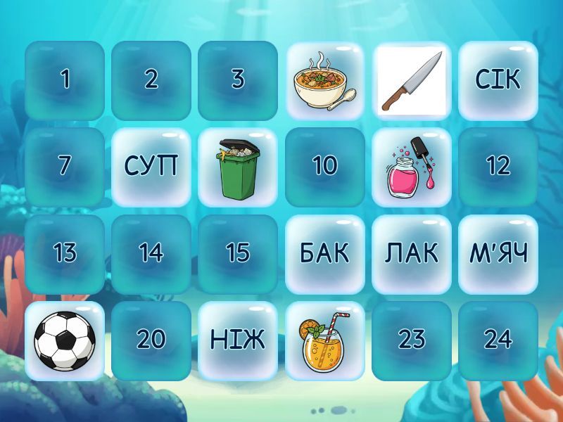 БАК, ЛАК, М'ЯЧ, СІК, СУП, НІЖ, МАК, КІТ, СИР, ФЕН, ПЕС, РОТ,