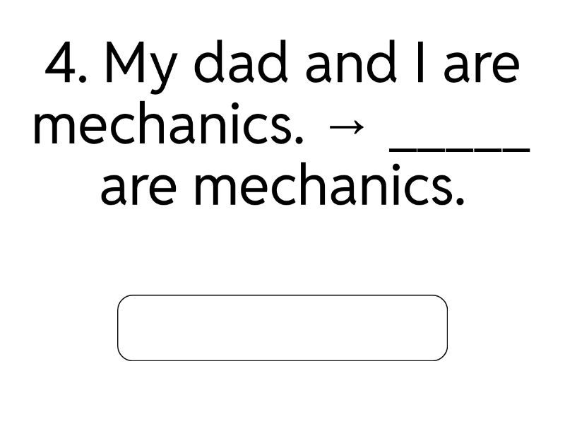 1. The alien is green. → _____ is green., 2. Anna is a great baker. → _____ is a great baker., 3. The moon is bright tonight. → _____ is bright tonight., 4. My dad and I are mechanics. → _____ are mechanics., 5. The chef and the greengrocer work together. → _____ work together., 6. You and your friend are in the spaceship. → _____ are in the spaceship., 7. This concert is loud! → _____ is loud!.