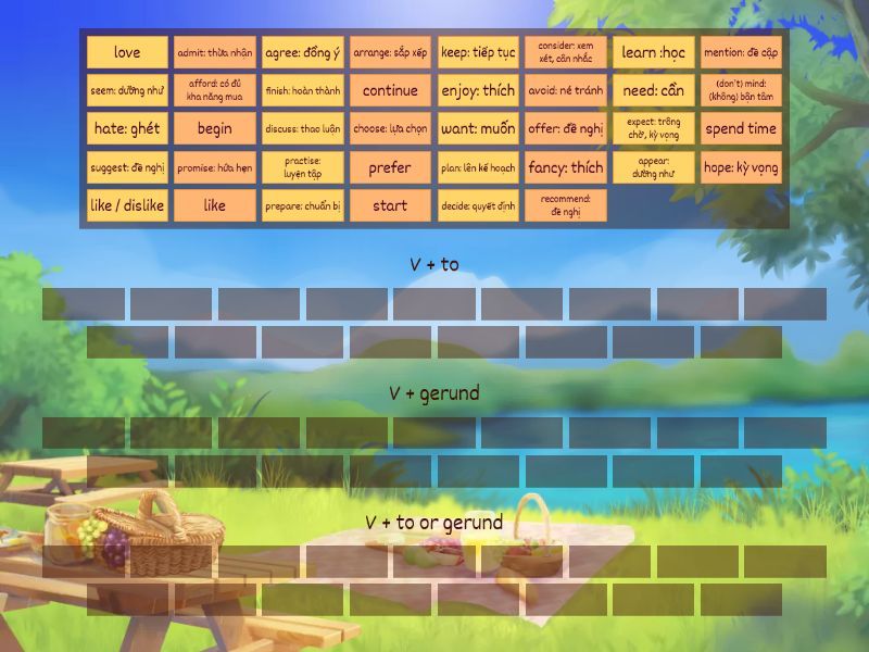 V + to: afford: có đủ khả năng mua, agree: đồng ý , appear: dường như , seem: dường như , arrange: sắp xếp , choose: lựa chọn , decide: quyết định , expect: trông chờ , kỳ vọng , hate: ghét, hope: kỳ vọng , learn :học , need: cần, offer: đề nghị , plan: lên kế hoạch , prepare: chuẩn bị , promise: hứa hẹn , want: muốn , V + gerund: enjoy: thích, fancy: thích , like / dislike , admit: thừa nhận , avoid: né tránh, consider: xem xét, cân nhắc , discuss: thảo luận , (don’t) mind: (không) bận tâm, finish: hoàn thành , keep: tiếp tục , mention: đề cập, practise: luyện tập, recommend: đề nghị , suggest: đề nghị, spend time, V + to or gerund: start, begin , like , love , prefer, continue ,