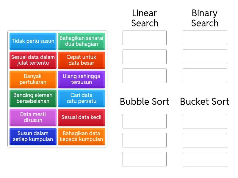 Linear Search: Cari data satu persatu, Tidak perlu susun, Sesuai data kecil, Binary Search: Data mesti disusun, Bahagikan senarai dua bahagian, Cepat untuk data besar, Bubble Sort: Banding elemen bersebelahan, Ulang sehingga tersusun, Banyak pertukaran, Bucket Sort: Bahagikan data kepada kumpulan, Sesuai data dalam julat tertentu, Susun dalam setiap kumpulan,