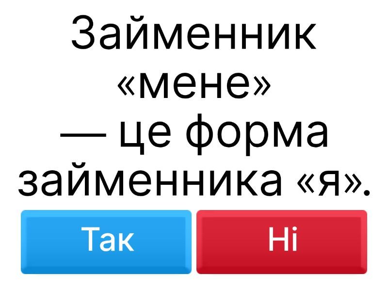 1) Займенник «мене» — це форма займенника «я». a) Так b) Ні 2) «Їм» — форма особового займенника вони. a) Так b) Ні 3) Після прийменників (про, до, з, біля) особові займенники завжди змінюють форму. a) Так b) Ні 4) Чергування о / і відбувається у всіх іменниках. a) Так b) Ні 5) Слово «його» може означати і “he”, і “his”. a) Так b) Ні 6) У слові «сніг — сніги» є чергування голосних. a) Так b) Ні 7) У слові «рік — роки» голосний І змінюється на О. a) Так b) Ні 8) Займенник «ми» має форму родового відмінка «нас». a) Так b) Ні