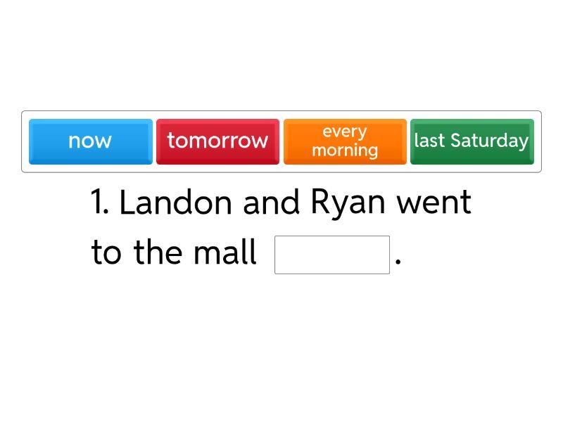 1. Landon and Ryan went to the mall ____. 2. Matthew and Ricky ____ to the mall every Saturday. 3. Timmy ____ lunch in the food court yesterday. They ____ have English class yesterday afternoon. 5. Mina ____ well every night. 6. Gene didn’t read books ____. 7. ____ the class go camping last Friday? Did they buy a new car ____? 9. No, they ____. They missed the bus yesterday 10. ____ you feel sad two days ago?