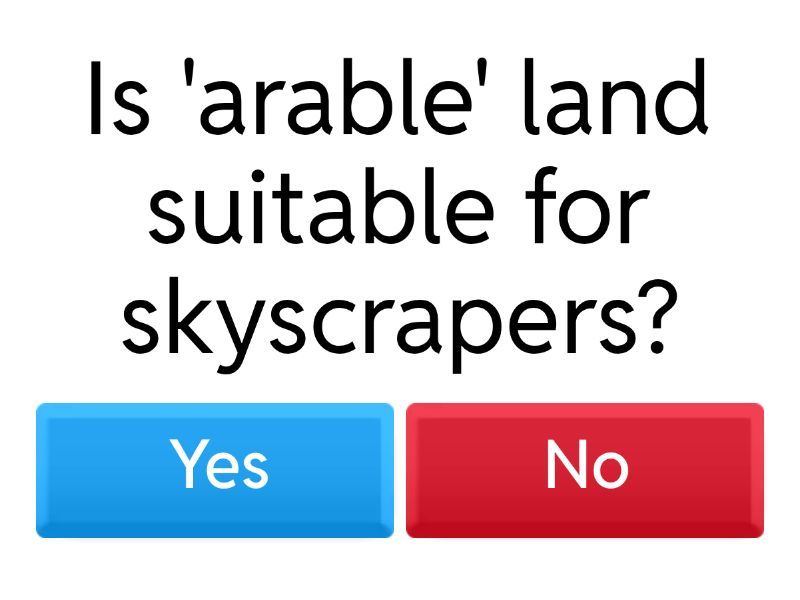 1) Is 'arable' land suitable for skyscrapers? a) Yes b) No 2) Does a 'pest' help crops grow? a) Yes b) No 3) Does 'irrigation' mean watering crops artificially? a) No b) Yes 4) Does 'undernourishment' mean eating too much? a) No b) Yes 5) If you 'run out of' something, do you have a lot left? a) Yes b) No 6) Does 'fertiliser' improve soil quality? a) No b) Yes 7) Is a 'devastating' event mild? a) Yes b) No 8) Does 'terrain' refer only to flat fields? a) Yes b) No