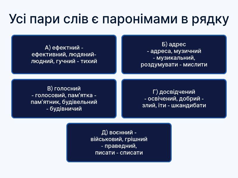 1) Усі пари слів є паронімами в рядку a) А) ефектний - ефективний, людяний- людний, гучний - тихий b) Б) адрес - адреса, музичний - музикальний, роздумувати - мислити c) В) голосний - голосовий, пам'ятка - пам'ятник, будівельний - будівничий d) Г) досвідчений - освічений, добрий - злий, іти - шкандибати e) Д) воєнний - військовий, грішний - праведний, писати - списати 2) Слово музичний (-а, -е) поєднується з усіма словами, ОКРІМ a) А) репертуар b) Б) слух c) В) мистецтво d) Г) інструмент 3) Слово ефектний (-а, -е, -і) поєднується з усіма словами, ОКРІМ a) А) шоу b) Б) стрибок c) В) вихід d) Г) ліки e) Д) жінка 4) Слово сердечний (-а, -е, -і) поєднується з усіма словами, ОКРІМ a) А) переживання b) Б) розмова c) В) жаль d) Г) напад e) Д) вітання 5) Слово дружній (-я, -є, -і) поєднується з усіма словами, ОКРІМ a) А) стосунки b) Б) атмосфера c) В) візит d) Г) бесіда e) Д) праця 6) Слово військовий (-а, -е) поєднується з усіма словами, ОКРІМ a) А) заклад b) Б) присяга c) В) літак d) Г) лікар e) Д) період 7) Слово лікарський (-а, -е) поєднується з усіма словами, ОКРІМ a) А) комплекс b) Б) кабінет c) В) контроль d) Г) товариство e) Д) мораль 8) Помилку через сплутування паронімів допущено в рядку a) А) ефективні ліки b) Б) людяний майдан c) В) будівельний майданчик d) Г) ефектний одяг e) Д) дільничий лікар 9) Лексично правильне словосполучення утворить прикметник повчальний з іменником a) А) заклад b) Б) план c) В) ефект d) Г) досвід e) Д) метод 10) Лексично НЕПРАВИЛЬНЕ словосполучення утворить іменник легіон із прикметником a) А) іноземний b) Б) почесний c) В) промисловий d) Г) жіночий e) Д) військовий 11) Лексичну помилку допущено в рядку a) А) обсяг продажу b) Б) об'єм басейну c) В) змістова доповідь d) Г) програмовий матеріал 12) Лексичну помилку допущено в рядку a) А) театральний квиток, оголошувати наказ b) Б) проголошувати незалежність, вносити вклад c) В) екзаменаційний білет, виголошувати погрозу d) Г) лотерейний квиток, робити внесок