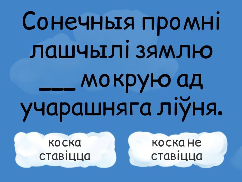 1) Сонечныя промні лашчылі зямлю ___ мокрую ад учарашняга ліўня. a) коска ставіцца b) коска не ставіцца 2) Пафарбаваныя марозам __ заснулі ціхія бярозы пад акном. a) коска ставіцца b) коска не ставіцца 3) Начное неба__ ўсыпанае зорамі__ нагадвала вышыты срэбрам дыван. a) коска ставіцца b) коска не ставіцца 4) Ефрасіння Полацкая__ ці Прадслава__ стала першай з нашых жанчын, якую прылічылі да святых. a) коска ставіцца b) коска не ставіцца 5) Некалі праца хатніка __ загадчыка хаты-чытальні __ лічылася адной з самых цікавых. a) коска ставіцца b) коска не ставіцца 6) На нашым шляху паўсюдна рос дзікі шыпшыннік__ гаючая краса тайгі. a) коска ставіцца b) коска не ставіцца 7) Апранутая ў чорную світку__ варона ўважліва сачыла за мітуслівымі вераб’ямі. a) коска ставіцца b) коска не ставіцца 8) Сухацвет__ ці бяссмертнік__ усѐ лета жаўцее на адкрытых пясчаных мясцінах. a) коска ставіцца b) коска не ставіцца 9) Падбадзѐраны цѐплым сонейкам__ ён (дрозд) высвіствае свае песні. a) коска ставіцца b) коска не ставіцца 10) Заснаваная ў Вільні Францыскам Скарынам__ друкарня стала першай ва Усходняй Еўропе. a) коска ставіцца b) коска не ставіцца 11) Бурштын __ сапраўднае багацце зямлі __ называюць "сонечным камнем". a) коска ставіцца b) коска не ставіцца 12) І вось ён __ вучань першага класа __перамог на музычным конкурсе. a) коска ставіцца b) коска не ставіцца 13) Над галавой звініць жаўрук, да працы кліча нас __ людзей і пчолак. a) коска ставіцца b) коска не ставіцца 14) Сонца __ вялікае, барвовае __ узнімалася над зямлёю. a) коска ставіцца b) коска не ставіцца 15) Раззлаваны на свае няўдачы __ ён доўга не мог вярнуць сабе душэўны спакой. a) коска ставіцца b) коска не ставіцца 16) Раней на свята __ Багач вяскоўцы ўрачыста прыносілі апошні сноп жыта ў хату гаспадара, які сабраў лепшы ўраджай. a) коска ставіцца b) коска не ставіцца 17) Над горадам апускаецца __ прыбраная ў зоры __ ноч. a) коска ставіцца b) коска не ставіцца 18) Саргасаваму мору назву далі __ занесеныя сюды марскімі хвалямі __ водарасці. a) коска ставіцца b) коска не ставіцца 19) Маладая гаспадыня __ Ліда зрабіла новую кватэру вельмі ўтульнай. a) коска ставіцца b) коска не ставіцца 20) Пасоленыя ў дубовых бочках __ былі некалі грузды абавязковай стравай на сялянскім стале. a) коска ставіцца b) коска не ставіцца