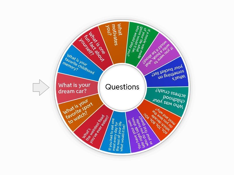 What is your favorite childhood memory?, What is one fun fact about yourself?, What motivates you?, If a movie was made of your life what genre would it be, who would play you?, If you were to write a book, what would it be about?, What's something on your bucket list?, Who was your childhood actress crush?, 60s, 70s, 80s, 90s: Which decade do you love the most and why?, You have your own late night talk show, who do you invite as your first guest?, If you had to eat one meal every day for the rest of your life what would it be?, What’s the weirdest food you’ve ever eaten?, What is your favorite sport to watch? , What is your dream car? .