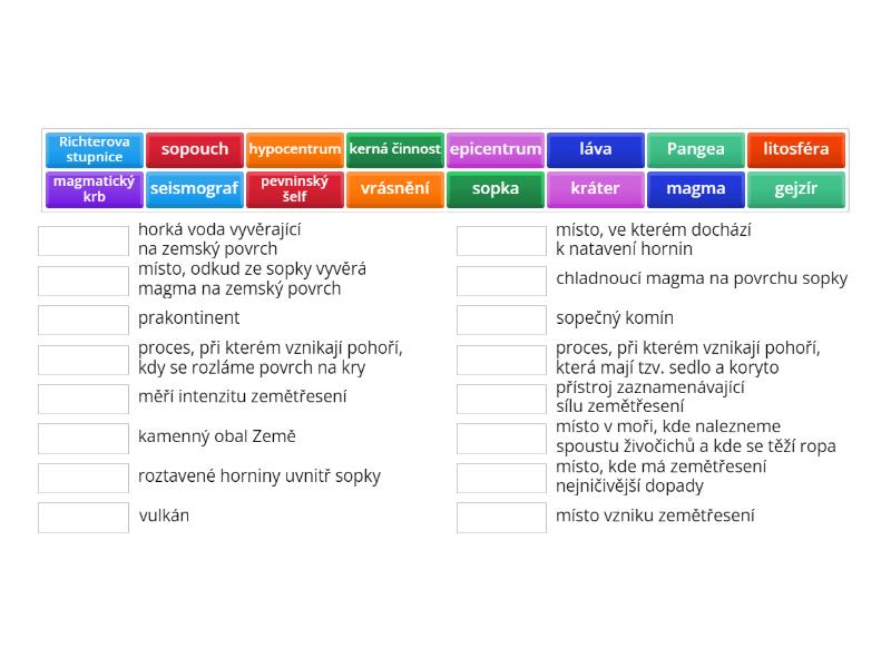 epicentrum - místo, kde má zemětřesení nejničivější dopady, hypocentrum - místo vzniku zemětřesení, sopouch - sopečný komín, Pangea - prakontinent, vrásnění - proces, při kterém vznikají pohoří, která mají tzv. sedlo a koryto, kerná činnost - proces, při kterém vznikají pohoří, kdy se rozláme povrch na kry, láva - chladnoucí magma na povrchu sopky, magma - roztavené horniny uvnitř sopky, sopka - vulkán, pevninský šelf - místo v moři, kde nalezneme spoustu živočichů a kde se těží ropa, Richterova stupnice - měří intenzitu zemětřesení, seismograf - přístroj zaznamenávající sílu zemětřesení, kráter - místo, odkud ze sopky vyvěrá magma na zemský povrch, magmatický krb - místo, ve kterém dochází k natavení hornin, gejzír - horká voda vyvěrající na zemský povrch, litosféra - kamenný obal Země,