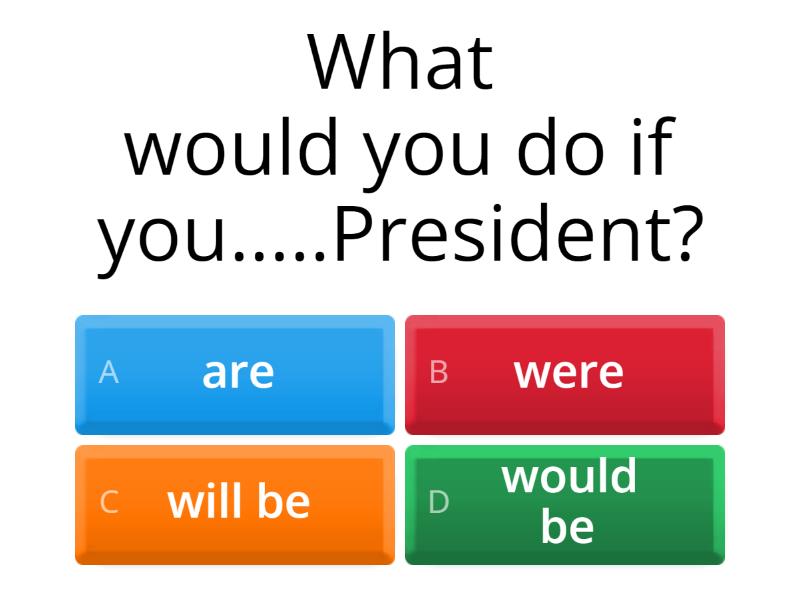1) What would you do if you.....President? a) are b) were c) will be d) would be 2) If public transport .....free, less people would use their cars. a) is b) are c) were d) would be 3) If you.....rich, what car would you have? a) are b) will be c) would be d) were 4) If your boss .....you to work all weekend, what would you say? a) asks b) asked c) would ask d) will ask 5) If I went to Russia, I .....the Red Square. a) would visit b) visited c) would visited d) visit 6) I....more exercise if I were you. a) take b) took c) would took d) would take 7) I.....to him if I were you. a) don't listen b) didn't listen c) wouldn't listen d) won't listen 8) If you ....the last person in the world, I .....you for help. a) are - would ask b) were - will help c) would be - helped d) were - would ask 9) I .... that, if I were in your shoes. a) didn't do b) wouldn't do c) won't do d) don't do 10) If my company asked me to move to another country, I......... . a) refused b) refuse c) will refuse d) would refuse