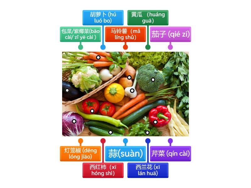 胡萝卜 (hú luó bo), 西红柿(xī hóng shì), 灯笼椒 (dēng lóng jiāo), 黄瓜 (huáng guā), 茄子 (qié zi), 西兰花 (xī lán huā), 包菜/紫椰菜(bāo cài/ zǐ yē cài ), 马铃薯(mǎ líng shǔ), 芹菜 (qín cài), 蒜(suàn).