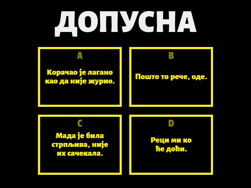 1) ВРЕМЕНСКА a) Реци ми ко ће доћи. b) Мада је била стрпљива, није их сачекала. c) Идем у продавницу да купим хлеб. d) Пошто то рече, оде. 2) ЗАВИСНОУПИТНА ИЗРИЧНА a) Мада је била стрпљива, није их сачекала. b) Корачао је лагано као да није журио. c) Реци ми ко ће доћи. d) Он се толико уморио да је отишао да спава. 3) ОДНОСНА a) Корачао је лагано као да није журио. b) Ко пита, не скита. c) Идем у продавницу да купим хлеб. d) Он се толико уморио да је отишао да спава. 4) ПОСЛЕДИЧНА a) Он се толико уморио да је отишао да спава. b) Љут је пошто му се нисте јавили. c) Ко пита, не скита. d) Мислио сам да ћеш сачувати тајну. 5) НАМЕРНА a) Идем у продавницу да купим хлеб. b) Ко пита, не скита. c) Чекаћу те тамо где смо се договорили. d) Он се толико уморио да је отишао да спава. 6) ДОПУСНА a) Корачао је лагано као да није журио. b) Пошто то рече, оде. c) Мада је била стрпљива, није их сачекала. d) Реци ми ко ће доћи. 7) УЗРОЧНА a) Љут је пошто му се нисте јавили. b) Мада је била стрпљива, није их сачекала. c) Ко пита, не скита. d) Реци ми ко ће доћи. 8) ПОРЕДБЕНА a) Реци ми ко ће доћи. b) Корачао је лагано као да није журио. c) Ко пита, не скита. d) Пошто то рече, оде. 9) МЕСНА a) Мислио сам да ћеш сачувати тајну. b) Чекаћу те тамо где смо се договорили. c) Реци ми ко ће доћи. d) Ко пита, не скита. 10) ИЗРИЧНА a) Мада је била стрпљива, није их сачекала. b) Мислио сам да ћеш сачувати тајну. c) Чекаћу те тамо где смо се договорили. d) Он се толико уморио да је отишао да спава.
