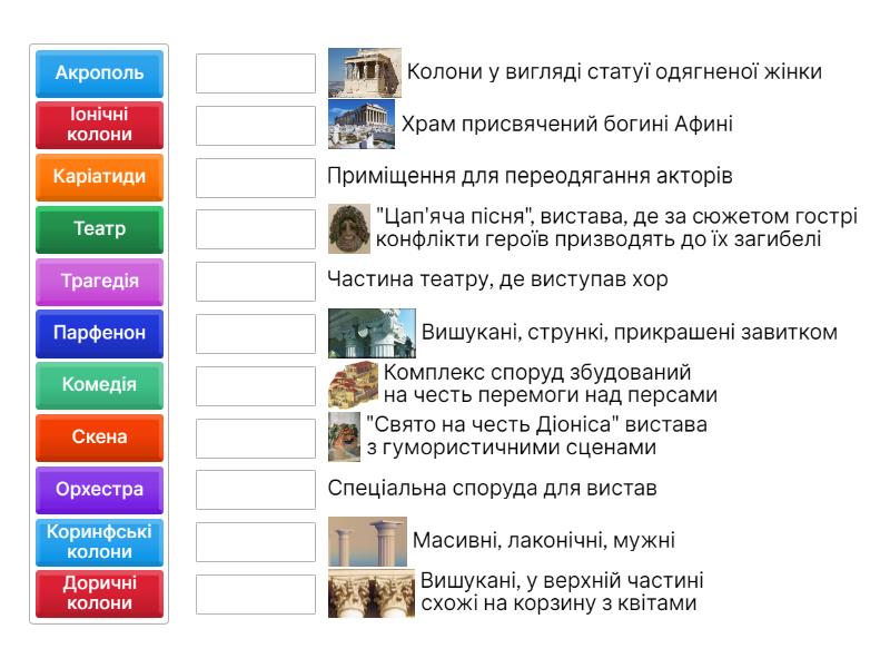 Доричні колони - Масивні, лаконічні, мужні, Іонічні колони - Вишукані, стрункі, прикрашені завитком, Коринфські колони - Вишукані, у верхній частині схожі на корзину з квітами, Каріатиди - Колони у вигляді статуї одягненої жінки, Акрополь - Комплекс споруд збудований на честь перемоги над персами, Парфенон - Храм присвячений богині Афині, Театр - Спеціальна споруда для вистав, Орхестра - Частина театру, де виступав хор, Скена - Приміщення для переодягання акторів, Трагедія - "Цап'яча пісня", вистава, де за сюжетом гострі конфлікти героїв призводять до їх загибелі, Комедія - "Свято на честь Діоніса" вистава з гумористичними сценами,