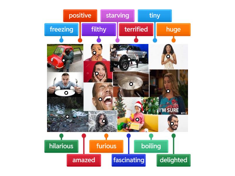 tiny, terrified, huge, delighted, starving, fascinating, boiling, positive, filthy, freezing, amazed, furious, hilarious.