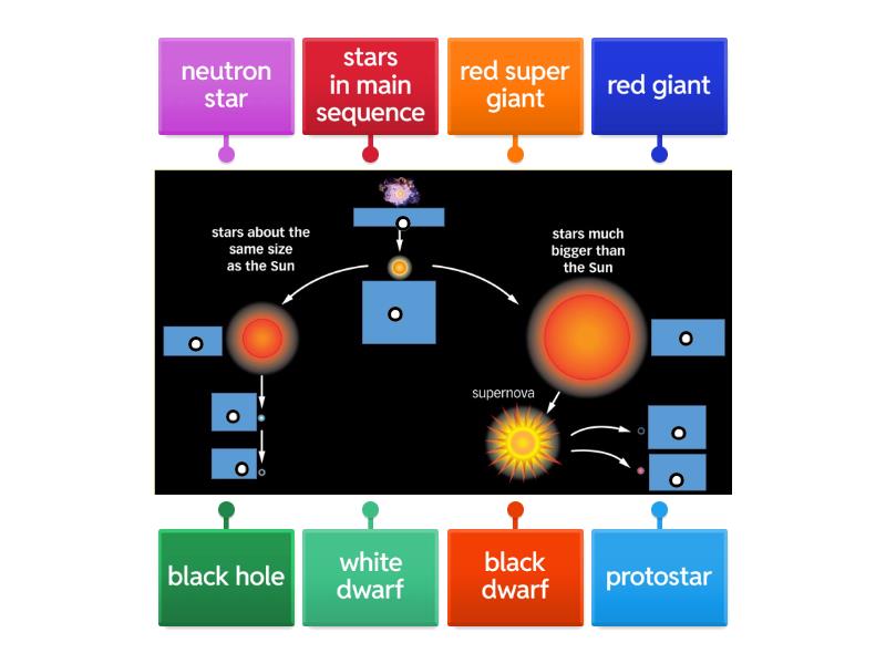 protostar, stars in main sequence, red super giant, black hole, neutron star, red giant, white dwarf, black dwarf.