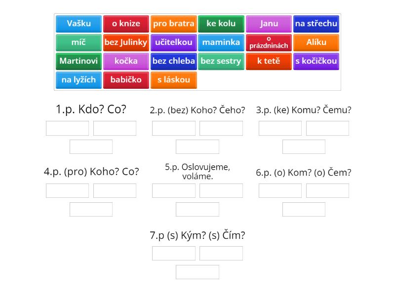 1.p. Kdo? Co?: maminka, kočka, míč, 2.p. (bez) Koho? Čeho?: bez sestry, bez Julinky, bez chleba, 3.p. (ke) Komu? Čemu?: k tetě, Martinovi, ke kolu, 4.p. (pro) Koho? Co?: Janu, pro bratra, na střechu, 5.p. Oslovujeme, voláme.: babičko, Alíku, Vašku, 6.p. (o) Kom? (o) Čem?: o prázdninách, na lyžích, o knize, 7.p (s) Kým? (s) Čím?: s kočičkou, s láskou, učitelkou,