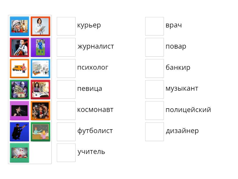 повар, полицейский, дизайнер, музыкант , банкир, космонавт, врач, учитель, певица, футболист, психолог, курьер, журналист,