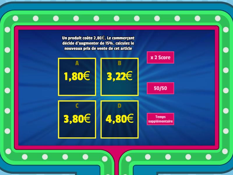 1) Un produit coûte 2,80€. Le commerçant décide d'augmenter de 15%. calculez le nouveaux prix de vente de cet article a) 1,80€ b) 3,22€ c) 3,80€ d) 4,80€ 2) Un produit coûte 15,60€. Le commerçant décide d'augmenter de 20%. calculez le nouveaux prix de vente de cet article a) 18,72€ b) 19,78€ c) 16,78€ d) 15,45€ 3) Un produit coûte 277€. Le commerçant décide d'augmenter de 5%. calculez le nouveaux prix de vente de cet article a) 309,78€ b) 290,89€ c) 290,85€ d) 309,80€ 4) Un produit coûte 13,22€. Le commerçant décide d'augmenter de 12%. calculez le nouveaux prix de vente de cet article a) 14,81€ b) 14,21€ c) 15,25€ d) 13,77€ 5) Un produit coûte 1,64€. Le commerçant décide d'augmenter de 10%. calculez le nouveaux prix de vente de cet article a) 1.80€ b) 1.90€ c) 1.10€ d) 1,11€ 6) Un produit coûte 8,20€. Le commerçant décide d'augmenter de 30%. calculez le nouveaux prix de vente de cet article a) 9,66€ b) 7,66€ c) 10,66€ d) 11,66€ 7) Un produit coûte 6,40€. Le commerçant décide d'augmenter de 8%. calculez le nouveaux prix de vente de cet article a) 5,58€ b) 6,91€ c) 7,78€ d) 6,80€ 8) Un produit coûte 142€. Le commerçant décide d'augmenter de 5%. calculez le nouveaux prix de vente de cet article a) 145,78€ b) 158,59€ c) 149,1€ d) 158,45€ 9) Un produit coûte 1,48€. Le commerçant décide d'augmenter de 25%. calculez le nouveaux prix de vente de cet article a) 1,65€ b) 1,55€ c) 1,85€ d) 1,95€ 10) Le premier code est le premier chiffre de l'énigme suivante 159x33% a) 62.47€ b) 52.57€ c) 42.47€ d) 32.57€