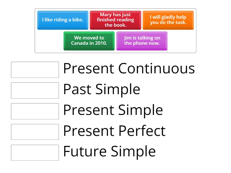 I like riding a bike. - Present Simple, Mary has just finished reading the book. - Present Perfect, We moved to Canada in 2010. - Past Simple, I will gladly help you do the task. - Future Simple, Jim is talking on the phone now. - Present Continuous,